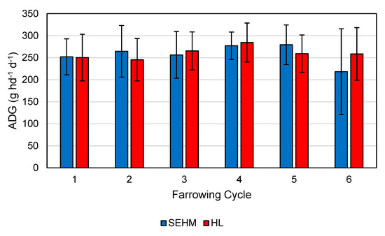 Average daily gain (ADG) across SEHM and HL treatments by farrowing cycle. Error bars represent one standard deviation of the farrowing cycle mean. This data represents the raw results, and thus, no statistical analysis between cycles was performed.