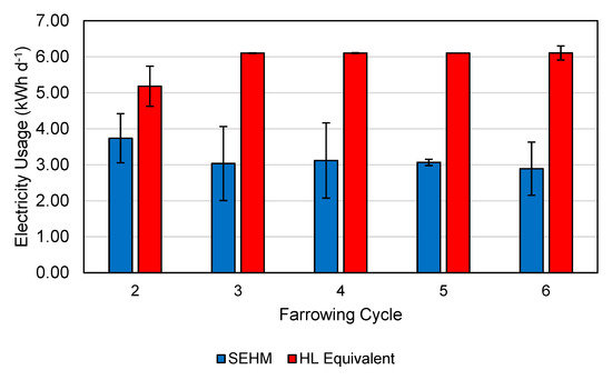 Electricity usage per day for SEHMs over five farrowing cycles utilized for the energy usage analysis. Error bars represent one standard deviation of the mean. Only the units with both litters farrowing on the same day were utilized for comparison. Note, farrowing cycle 2 had a higher maximum output setting than the later cycles, and the lower heat lamp equivalent is due to power outage issues on the farm late in the cycle.