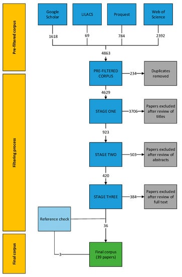 To increase the possibility of capturing all relevant papers, references from papers in the final corpus were screened using the above three-stage filtering process. All references that matched the above inclusion/exclusion criteria were included in the final corpus.