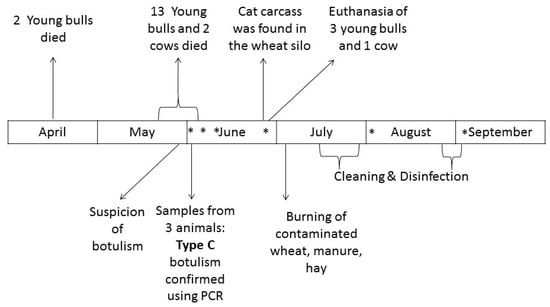 Twenty-four young bulls were raised in barn number 6, and 4 fattening cows were housed in barn number 3. The rest of the herd was grazing in outside pastures at the time of the outbreak. Figure 2 presents the chronology of events.