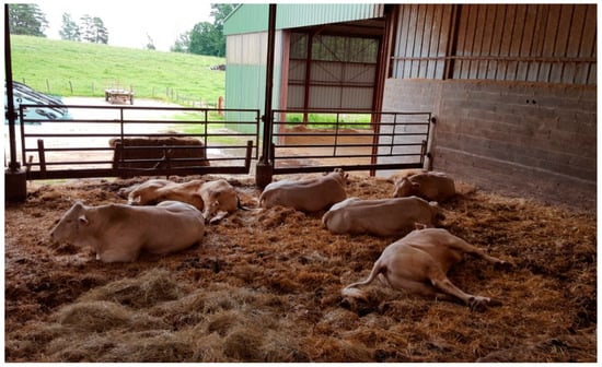 Young bulls with clinical signs (in house 6) on 31 May. One young bull (no.2 in Table 2) died just before the veterinary officer’s visit (top left of the picture), and a second one (no.3 in Table 2) died just after the departure of the veterinarian officer (bottom right of the picture). Note recumbency, apathy, and weakness.