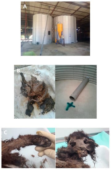 Carcass of a cat found in the wheat silo (wheat that was used to make flour distributed to animals). (A) Silo used for wheat and barley storage, mill, and bushel after cleaning and disinfection. (B) On the left, the cat carcass just after its discovery and on the right its exact position in the wheat silo. (C) Two pictures during the carcass examination at the laboratory before sampling for C. botulinum type C gene detection.