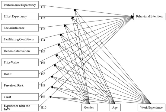 To adjust the UTAUT 2 model to this study’s issue, three more constructs were added to the model: perceived risk, trust and experience with the IAW. The background for these considerations is a qualitative survey among farmers on the IAW [8]. Again, these constructs are believed to moderate the strength of the relationship between the constructs and the behavioral intention of age, gender and work experience.