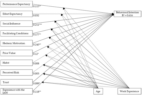 Results of multigroup analysis: the moderating effect of age and work experience between the constructs and behavioral intention.