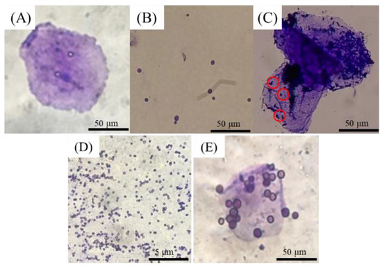 Photo of broiler crop epithelial cell (A), Saccharomyces cerevisiae (B), Saccharomyces cerevisiae adhering on the epithelial cell (red cycle) (C), spores of Aspergillus oryzae (D), and spores adhering on the epithelial cell (E), screened by an optical microscope.