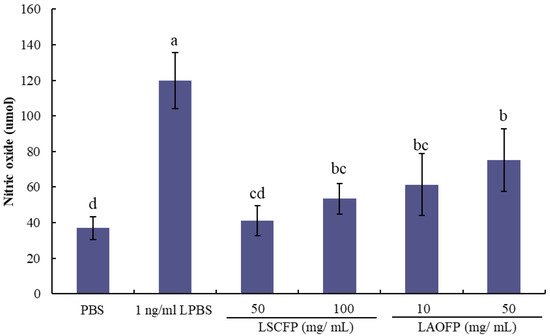 Nitric oxide release amount of phosphate buffer solution (PBS, control), 1 ng/mL lipopolysaccharide (LPBS, negative control), 50 mg/mL Saccharomyces cerevisiae fermented products extraction, and 1 ng/mL LPS include (50 mg/mL LSCFP), 100 mg/mL Saccharomyces cerevisiae fermented products extraction and 1 ng/mL LPS include (100 mg/mL LSCFP), 10 mg/mL Aspergillus oryzae fermented products extraction and 1 ng/mL LPS include (10 mg/mL LAOFP), and 25 mg/mL Aspergillus oryzae fermented products extraction and 1 ng/mL LPS include (25 mg/mL LAOFP). a,b,c,d Means within the same rows without the same superscript letter are significantly different (p < 0.05).