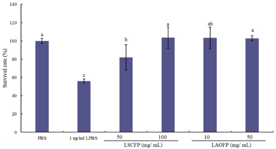 As the results shown in Figure 3, the MTT assay has an opposite result of NO release amount on the data. LPS stimulates PBMCs and causes the survival rate of PBMCs to decrease significantly. However, adding SCFP or AOFP extraction could increase the PBMCs survival rate after stimulation by LPS (p < 0.05). Among them, there were not significant differences in the LAOFP group and 100 mg/mL LSCFP group, meaning that AOFP had the same effect on increasing the survival rate in the MTT test with a lower concentration.