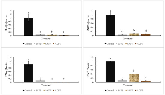 The results of mRNA expression level of immunomodulatory genes in chicken PBMCs are shown in Figure 5. As seen, the IL-1ß, iNOS, IFN-γ, and NFκB mRNA expression significantly decreased in SCFP, SAFP, and AOFP (p < 0.05). Furthermore, it is worth noting that AOFP can reduce the inflammation-related mRNA content most effectively.