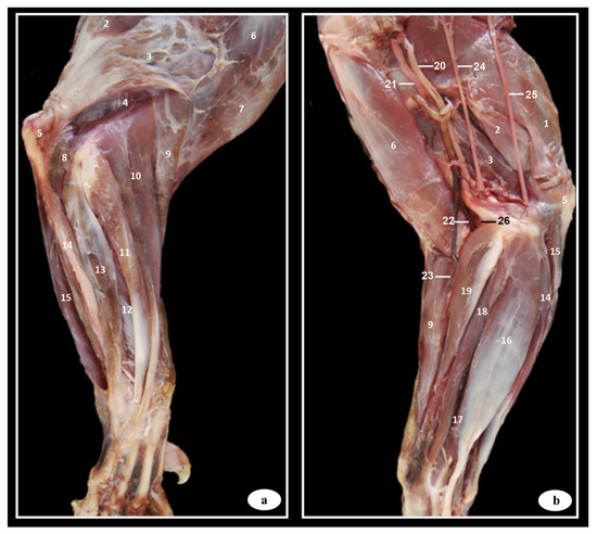 Dissection images of the Bengal tiger forelimb. (a) Lateral aspect and (b) medial aspect. 1. Tensor fasciae antebrachii muscle; 2. Triceps brachii muscle (long head); 3. Triceps brachii muscle (lateral head); 4. Triceps brachii muscle (accessory head); 5. Olecranon tuberosity; 6. Brachialis muscle; 7. Biceps brachii muscle; 8. Anconeus muscle; 9. Extensor carpi radialis muscle; 10. Extensor digitorum communis muscle; 11. Extensor digitorum lateralis muscle; 12. Abductor digiti I longus muscle; 13. Extensor carpi ulnaris muscle; 14. Flexor carpi ulnaris muscle (humeral head); 15. Flexor carpi ulnaris muscle (cubital head); 16. Flexor digitorum superficialis muscle; 17. Flexor digitorum profundus muscle; 18. Flexor carpi radialis muscle; 19. Pronator teres muscle; 20. Brachial vein; 21. Brachial artery; 22. Median artery; 23. Radial artery; 24. Radial nerve; 25. Cubital nerve; 26. Median nerve.