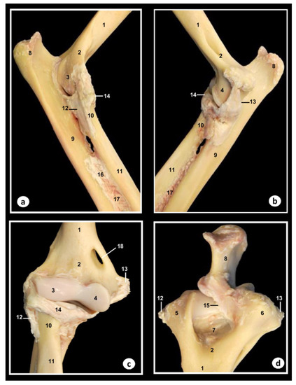 Dissection images of the Bengal tiger right elbow joint. (a) Lateral aspect, (b) medial aspect, (c) cranial aspect, and (d) proximal aspect. 1. Humerus (body); 2. Humerus (metaphysis); 3. Humerus (lateral condyle); 4. Humerus (medial condyle); 5. Humerus (lateral epicondyle); 6. Humerus (medial epicondyle); 7. Olecranon fossa; 8. Olecranon tuberosity; 9. Ulna (body); 10. Radius (head); 11. Radius (body); 12. Lateral collateral ligament; 13. Medial collateral ligament; 14. Radial annular ligament; 15. Olecranon ligament; 16. Interosseoum antebrachii ligament; 17. Membrana interossea antebrachia; 18. Supracondylar foramen.
