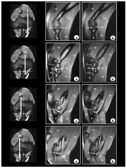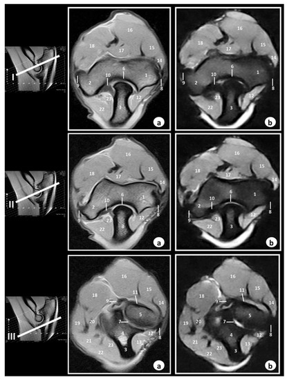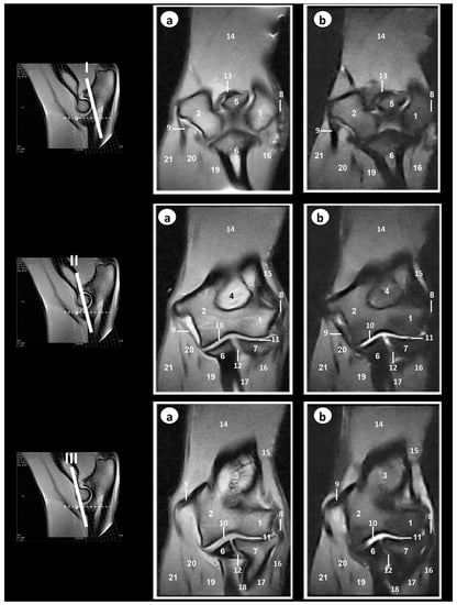Magnetic resonance imaging (MRI) is commonly used, especially to assess the musculoskeletal system in humans and animals, due to its good image resolution, superior soft tissue contrast among different anatomical structures, and use of a magnetic field rather than ionizing radiation, compared with other imaging diagnostic technique [1,2,3]. In veterinary medicine, MRI anatomical studies have been performed in the elbow region of equines [4] and canines [5,6,7]. Several reports have provided descriptions of clinical findings regarding the elbow joint using MRI [8,9,10,11,12,13,14,15].