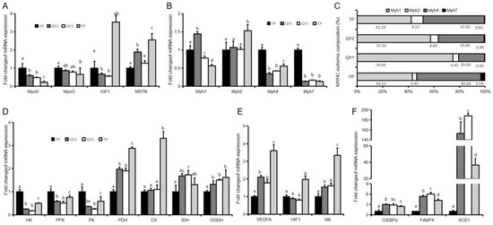 Gene expression in longissimus dorsi muscle. (A) The expression of genes involved in muscle development in longissimus dorsi muscle. Myogenic differentiation 1 (MyoD), myogenin (MyoG), Myocyte enhancer factor 2c (Mef2c), Myostatin (MSTN). (B,C) The expression and abundance of different subtypes of Myosin heavy chain (MyHC). (D) The expression of genes involved in muscle glycolysis and aerobic oxidation. Hexokinase (HK), phosphofructokinase (PFK), pyruvate kinase (PK), pyruvate dehydrogenase (PDH), citrate synthase (CS), isocitrate dehydrogenase (IDH), oxoglutarate dehydrogenase (OGDH). (E) The expression of vascular endothelial growth factor-A (VEGFA), hypoxia inducible factor-1 (HIF1), and myoglobin (Mb). (F) The expression of CCAAT/enhancer binding protein (C/EBPα), adipocyte fattyacid-binding protein (FABP4), and stearyl coenzyme A dehydrogenase-1 (SCD1), n = 3–6. All results are presented as means ± SEM. Different letters indicate significant difference (p < 0.05).