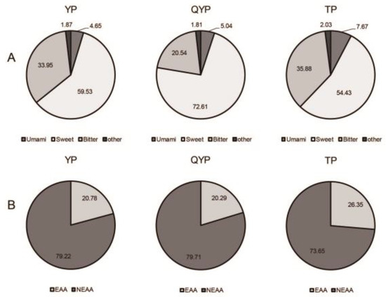 Further analysis indicated that the proportion of umami amino acids in TP was 7.67%, which was significantly higher (p < 0.05) than was observed in both YP and QYP (Figure 3A). The sweet amino acid concentration of QYP was as high as 72.61%, and 77.01% for essential amino acids (EAA), which were significantly higher (p < 0.05) than YP and TP (Figure 3A,B).