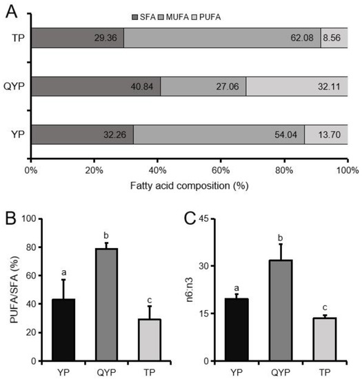 Next, analysis of the ratios of polyunsaturated fatty acid (PUFA) and PUFA/SFA (saturated fatty acid) indicated significantly higher levels in QYP than in both YP and TP (p < 0.05). In contrast, TP were observed to have the highest levels of monounsaturated fatty acids (MUFA) of TP (p < 0.05). It is worth noting that the n6/n3 ratio of QYP was observed to be significantly higher (p < 0.05) than that of YP and TP (Figure 4).
