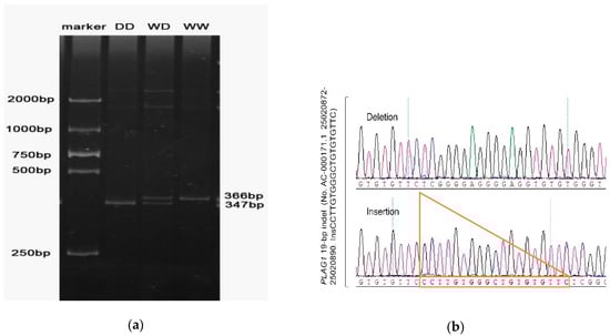 PCR amplification products were genotyped by 10% polyacrylamide gel electrophoresis. The bands of the electrophoresis were clear and bright, the length of the bands was consistent with the prediction, and three genotype bands were present, which were WW, DD, and WD. The sequencing results of this site are also consistent with the results displayed by the running gel (Figure 1).