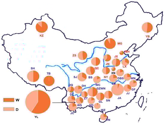 According to the regional information of the breeds classified in Animal Genetic Resources In China-Bovines, the results showed that, in the northern group, the frequencies of the W and D alleles were 0.78 and 0.22, respectively, and the frequency of allele W accounted for the majority. In the central group, the frequencies of the W and D alleles were 0.51 and 0.49, respectively, and the frequencies of the two alleles were nearly equal. In the southern group, the frequencies of the W and D alleles were 0.31 and 0.69, respectively, and the frequency of the W allele was lower. Similar to the results of the northern and central groups, in the commercial group, the frequencies of the W and D alleles were 0.59 and 0.41, respectively, and the frequency of the W allele was also higher than the D allele. The geographical distribution and allele frequencies of each breed are shown in Figure 2. In addition to the 35 domestic breeds shown in the figure below, for the allele frequencies of two foreign breeds used as the control, Angus cattle and Holstein cattle, the frequencies of the W allele were 0.68 and 0.65, respectively, and the frequencies of the D allele were 0.32 and 0.35, respectively. The results of genotypic and allele frequencies of the PLAG1 gene across the 37 cattle breeds are shown in Table S2 (Supplementary Materials). Meanwhile, the average body height of these cattle breeds is also given in Table S2 (Supplementary Materials) [17].