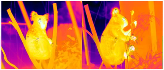 All thermal images were taken using the FLIR530TM Thermal Imaging Camera. Thermal images of each of the koalas were taken every 30 min between 8:00 and 17:00 (9 h a day) over three consecutive days in May 2018 for a total of 171 images (57 images per individual). Each image taken was focused and centred to the koala to incorporate as much of the body features within the image (Figure 1). Each image was taken within 1 m distance to the koala.
