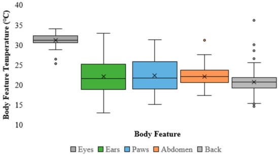 Boxplot demonstrating the range/spread of temperature (°C) for each body feature of a koala measured (from left to right: eyes; ears; paws; abdomen; back). The median (the line through each coloured box), average (“x”), and outliers (coloured circles) are shown for each body feature.