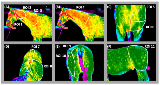 The regions of interest (ROIs) chosen for statistical analysis of thermographic data: (A) ROIs 1–3, (B) ROI 4, (C) ROIs 5–6, (D) ROIs 7–8, (E) ROIs 9–10, (F) ROI 11.