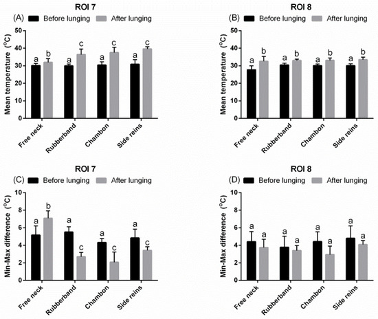 The superficial thermographic patterns of regions of interest (ROIs) of the back. Horses lunged with: freely moving head, rubber band, chambon, and triangle side reins, before and after effort. (A,C) ROI 7, (B,D) ROI 8, (A,B) Tmean, (C,D) Tdiff. Lower case letters indicate differences between measurements before and after an effort, as well as differences among freely moving head and type of lunging aid used. The differences were significant for p < 0.05. All values were reported as mean + SD.