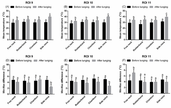The superficial thermographic patterns of regions of interest (ROIs) of the hindquarters. Horses lunged with: freely moving head, rubber band, chambon, and triangle side reins, before and after effort. (A,D) ROI 9, (B,E) ROI 10, (C,F) ROI 11, (A,B) Tmean, (C,D) Tdiff. Lower case letters indicate differences between measurements before and after an effort, as well as differences among freely moving head and type of lunging aid used. The differences were significant for p < 0.05. All values were reported as mean + SD.