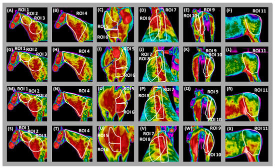 The thermographic images after training session with freely moving head (A–F), rubber band (G–L), chambon (M–R), and triangle side reins (S–X) of the same horse with the marked regions of interest (ROIs) chosen for statistical analysis: (A,G,M,S) ROIs 1–3; (B,H,N,T) ROI 4; (C,I,O,U) ROIs 5–6; (D,J,P,V) ROIs 7–8; (E,K,Q,W) ROIs 9–10; (F,L,R,X) ROI 11.