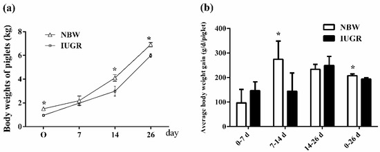 Analysis of body weight (a) and average body weight gain (b) in normal birth weight (NBW) and intrauterine growth retardation (IUGR) piglets during suckling from 0 to 26 days of age. Values are the means ± standard deviation; n = 20/group. Data were analyzed using unpaired, independent t-tests. * a significant difference was observed (p < 0.05). NBW, normal birth weight piglets; IUGR, intrauterine growth retardation piglets.