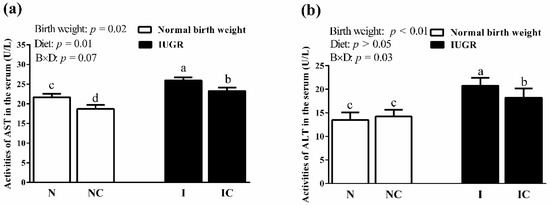 The activities of serum AST (Figure 2a) and ALT (Figure 2b) in the IUGR weaned piglets were significantly higher (p < 0.05) than those in the NBW weaned piglets. Diets supplemented with curcumin significantly decreased (p < 0.05) the activities of AST and ALT in the serum of IUGR weaned piglets. NBW piglets fed with curcumin diets also showed a significantly lower (p < 0.05) activity of serum AST than those of the NBW weaned piglets fed with control diets.