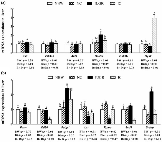 Influence of curcumin on the hepatic mRNA expressions of IUGR weaned piglets (a) insulin signal pathway, (b) lipid metabolism; 50 d). Values are the means ± standard deviation; n = 8/group. abcd denotes significant differences (p < 0.05). NBW, piglets with normal birth weights and fed with control diets; NC, NBW piglets fed with curcumin diets; IUGR, piglets with intrauterine growth retardation and fed with control diets; IC, IUGR piglets fed with curcumin diets; B, birth weight of piglets; D, curcumin diets; B × D, the interaction between the birth weight and curcumin diets. Irs1, insulin receptor substrate 1; Pik3c3, phosphatidylinositol 3-kinase catalytic subunit type 3; Akt2, serine/threonine kinase 2; Gsk3a, glycogen synthase kinase 3 alpha; Gsk3b, glycogen synthase kinase 3 beta; Gys2, glycogen synthase 2; Fasn, fatty acid synthase; Cd36, cluster of differentiation 36; Fabp1, liver fatty acid binding protein 1; Lxrα, liver × receptor; Ppara, peroxisome proliferator-activated receptor α; Scd1, stearoyl-CoA desaturase1; Srebp, sterol regulatory element binding proteins.