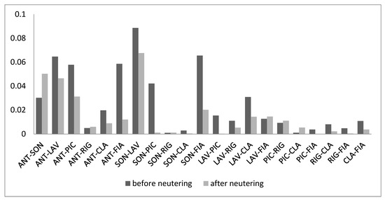 Dyadic association index before and after neutering.