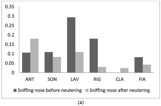 In particular, sniffing nose and rubbing increased in frequency only for two individuals (sniffing nose: ANT and CLA; rubbing: RIG and FIA) and decreased for all other cats (Figure 6a,b); overall, their variation was not significant (sniffing nose: T = 5, n = 6, p = 0.25; rubbing: T = 7, n = 6, p = 0.46). It is worth noting that rubbing and sniffing nose have been observed among adult males that never exchanged it before neutering (ANT-SON and ANT-RIG). The same males spent also slightly more time close to each other than before sterilization. Indeed, both behavioural patterns were positively correlated with the dyadic association index (Row-wise matrix correlation: Sniffing nose, Kr = 19, τrw = 0.60, n = 6, p = 0.005; rubbing; Kr = 18, τrw = 0.56, n = 6, p = 0.007).
