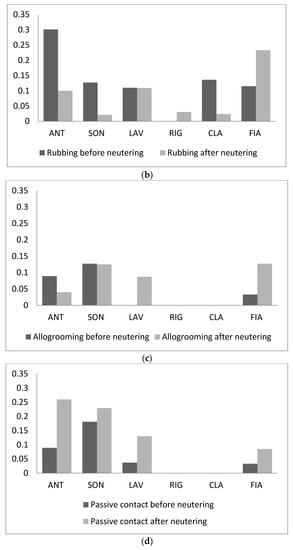 Allogroming and passive contact were not statistically analyzed since they were performed only by few cats in the colony. For the three cats that performed allogrooming (Figure 6c) before and after neutering, the frequency decreased slightly; one cat started showing this behaviour only after neutering. Finally, passive contact increased in frequency in all four cats that showed it before and after neutering (Figure 6d).