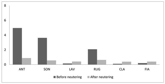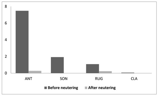 Frequency of aggressive behaviour (acts/h) in the absence of any source of competition before and after neutering.