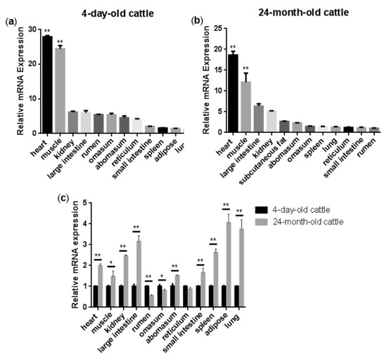 Figure 1a,b show the relative expression levels of the NENF gene in the four-day-old and 24-month-old Qinchuan cattle tissues and organs (including heart, spleen, lung, kidney, rumen, reticulum, omasum, abomasum, large intestine, small intestine, muscle, and adipose), respectively. The results showed that in the four-day-old Qinchuan cattle, NENF was predominantly expressed in the heart and muscle, followed by the kidney, large intestine, rumen, omasum, abomasum, reticulum, small intestine, spleen, adipose, and lung. In the 24-month-old Qinchuan cattle, significantly high transcript levels were observed in heart and muscle, followed by the large intestine, kidney, adipose, abomasum, omasum, spleen, lung, reticulum, small intestine, and rumen. The NENF mRNA level was elevated in the muscle of 24-month-old adult cattle compared with that in the 4-day-old neonatal calf (p < 0.01). In addition, compared with the four-day-old Qinchuan cattle, the relative expression level of NENF mRNA in adipose tissue in the 24-month-old Qinchuan cattle was significantly up-regulated (Figure 1c). Since 24 months is an important period of fat deposition in cattle, we speculate that the NENF gene may have an effect on the development of adipose tissue in cattle.