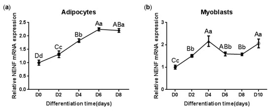 The NENF gene expression patterns during differentiation of bovine adipocytes and myoblasts: (a) Relative mRNA expression of NENF in bovine adipocytes; (b) Relative mRNA expression of NENF in bovine myoblasts. Error bars represent s.d. Different lowercases among different columns represent p < 0.05. Different uppercases among different columns represent p < 0.01.