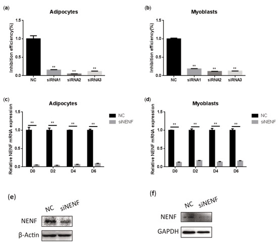To determine the interference efficiency of the three siRNAs that interfere with NENF gene expression, the siRNAs were transfected into bovine preadipocytes and myoblasts. Twenty-four hours after transfection, the RNA was extracted to detect the interference efficiency. The results showed that siRNA-3 had higher interference efficiency than the negative control group, reaching 95% and 89% in adipocytes and myoblasts, respectively (Figure 3a,b). In addition, cell morphology did not change compared to the control group, so siRNA-3 can be used in subsequent experiments. Subsequently, the interference efficiency of siRNA-3 was detected at 0, 2, 4, and 6 days after induction. Compared with the control group, the relative mRNA expression level of NENF was significantly down-regulated in adipocytes and myoblasts transfected with siNENF (Figure 3c,d). Western blot analysis showed that NENF protein expression also significantly decreased in siNENF transfected adipocytes and myoblasts on day 4. These results indicated that interference with the NENF gene by siRNA transfection in adipocytes and myoblasts were effective and successful.