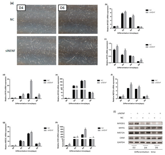 To determine whether knockdown of NENF gene expression could affect myoblast differentiation into myotubes, a NENF interference assay was performed using primary myoblasts. The changes in myoblast morphology were analyzed after NENF was knocked down, and the differentiation of myoblasts was induced. siNENF-transfected myoblasts formed much more and longer myotubes than the negative control (NC) group at day 4 and day 6 (Figure 5a). Moreover, the relative mRNA expression levels of the myoblast differentiation marker genes MYOD1, MYF5, MYF6, MYOG, MEF2A, MEF2C, and CKM were also detected at 0, 2, 4, and 6 days after induction, of which MYF5, MYF6, MEF2A, MEF2C, and CKM were significantly up-regulated in siNENF-transfected myoblasts (Figure 5b–h). Western blot analysis showed that the protein expression of MYOD1, MYF6, MEF2A, and CKM were also enhanced (Figure 5i).