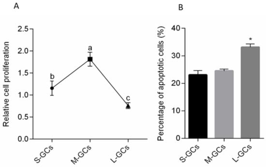 Figure 1. Proliferation and apoptosis of granulosa cells following 2 days of culture. The MTT assay kit was used to assess cell proliferation (A), and flow cytometry with an Annexin V-FITC apoptosis detection kit was used to assess the apoptotic GCs (B). Data are means ± SEM from three independent replicates. Different letters (A) and asterisks (B) in the diagram indicate a significant difference (* p < 0.05). S-GCs, GCs isolated from small follicles; M-GCs, GCs isolated from medium follicles; L-GCs, GCs isolated from large follicles.