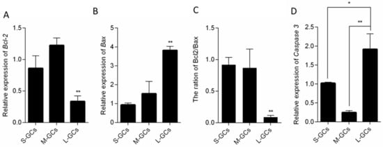 Figure 2. Relative mRNA level of apoptosis-related genes in GCs. Relative mRNA level of Bcl2 (A), Bax (B), the ratio of Bcl2/Bax (C) and Caspase 3 (D). Data are means ± SEM from three independent replicates. * p < 0.05, ** p < 0.01. S-GCs, GCs isolated from small follicles; M-GCs, GCs isolated from medium follicles; L-GCs, GCs isolated from large follicles.