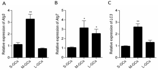 Figure 3. Relative mRNA level of autophagy-related genes in GCs. Relative mRNA level of Atg3 (A), Atg7 (B), and LC3 (C). Data are means ± SEM of three independent replicates. * p < 0.05, ** p < 0.01. S-GCs, GCs isolated from small follicles; M-GCs, GCs isolated from medium follicles; L-GCs, GCs isolated from large follicles.