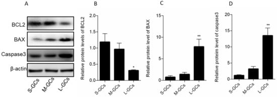 Figure 4. Apoptosis-related protein expression in GCs of follicles (A). Relative protein levels of BCL2 (B), BAX (C) and Caspase 3 (D). Data are means ± SEM of three independent replicates. * p < 0.05, ** p < 0.01. S-GCs, GCs isolated from small follicles; M-GCs, GCs isolated from medium follicles; L-GCs, GCs isolated from large follicles.