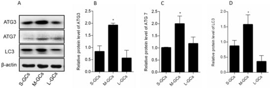 Figure 5. Autophagy-related protein expression in GCs of follicles (A). Relative protein levels of ATG3 (B), ATG7 (C) and LC3 (D). Data are means ± SEM of three independent replicates. * p < 0.05. S-GCs, GCs isolated from small follicles; M-GCs, GCs isolated from medium follicles; L-GCs, GCs isolated from large follicles.