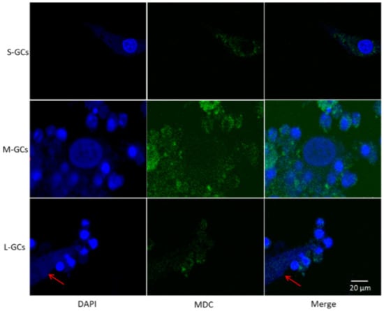 Figure 6. Double staining of DAPI and MDC to label the autophagosomes and GC nucleus. The red arrow indicated the DNA fragments in GCs of large follicles. Scale bars correspond to 20 μm. S-GCs, GCs isolated from small follicles; M-GCs, GCs isolated from medium follicles; L-GCs, GCs isolated from large follicles.