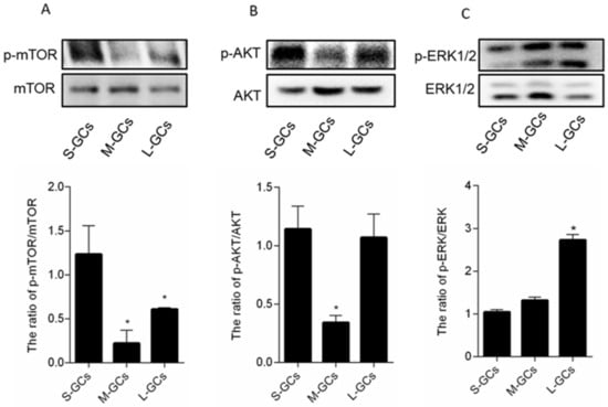Figure 7. Protein expression of the autophagy and apoptosis signaling pathways activated in GCs during follicular development. (A) mTOR and p-mTOR; (B) AKT and p-AKT; (C) ERK1/2 and p-ERK1/2. Data are means ± SEM of three independent replicates. * p < 0.05. S-GCs, GCs isolated from small follicles; M-GCs, GCs isolated from medium follicles; L-GCs, GCs isolated from large follicles.