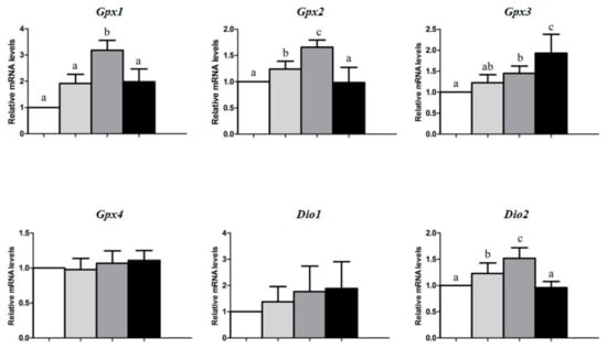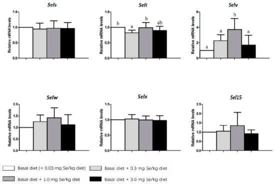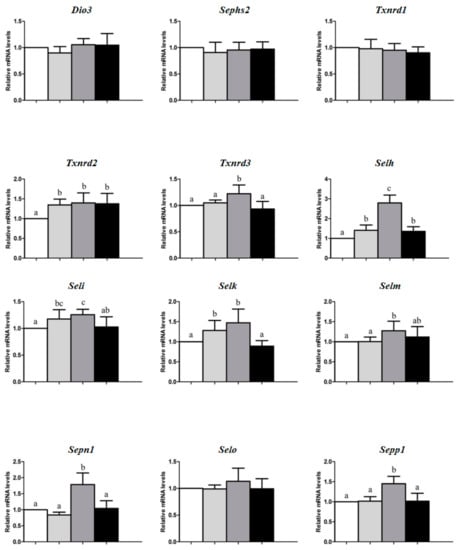 Dietary Se levels did not affect the mRNA levels of Gpx4, Dio1, Dio3, Sephs2, Txnrd1, Selo, Sels, Selw, Selx, and Sel15 in the spleen (p > 0.05).