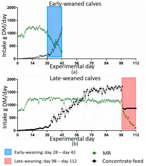 Data from computer-controlled mangers for roughage were not shown as there were technical problems with recognizing the individual calf, precluding data collection. As expected, MR intake was not different in the four groups during the first 28 days of trial when MR allowance was the same for all calves. Afterwards, MR intake followed the regimen of weaning. However, the pattern of voluntary solid feed intake over time varied between the weaning groups. Late-weaned calves consumed concentrate feed—despite consumption of the full amount of MR and even before MR supply was reduced, which led to a greater concentrate feed intake at the beginning of their weaning compared to the early-weaned group. This was in line with previous findings [5,13]. Later weaning (12.7 weeks) resulted in concentrate feed intake before weaning (close to 0.5 kg/d), whereas early-weaned calves (6.7 weeks) did not increase their concentrate intake before weaning started [13]. Eckert et al. [5] observed the same feed intake pattern for calves that were weaned with 6 or 8 weeks, with calves weaned later consuming more concentrate feed 1 week pre- and post-weaning. Male calves permitted to choose their preferred feed between MR and different solid feed components started to consume concentrate feed at the age of 49 days [26]. Despite the high MR allowance, calves consumed solid feed as observed in the present study. As milk production in the first lactation was associated with a higher intake of grain and forage at weaning [7], voluntary solid feed intake before weaning can be a potential benefit for later life production. Higher starter intake was related to a higher weight gain during weaning [13]. Late-weaned calves probably consumed more energy until their weaning, as they had a higher concentrate feed intake and still consumed MR. This was associated with the higher growth rates of late-weaned calves (Figure 2). This also indicates that even though the late-weaned calves had a high MR supply for 15 weeks, they started to consume solid feed and their rumen probably started to develop and to maturate. They even restricted their MR intake during the weaning period voluntarily more than they had to, which might indicate the ability of mature organs to function ruminant-specifically.