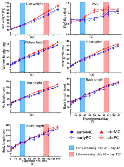 Live weight (LW), live weight gain (LWG), hip and withers height, body length, heart girth, back length, serum glucose, beta-hydroxybutyrate (BHB), non-esterified fatty acids (NEFA), leptin concentrations and plasma insulin concentrations were presented as least squares means (LSMeans) and standard errors (SEs) which were evaluated by repeated measures using the PROC MIXED procedure in SAS (V 9.4., SAS Institute Inc., Cary, NC, USA), and employing a restricted maximum likelihood model (REML). The model included a fixed factor of time, weaning age, parity of the mother and their interactions while the time was taken into consideration by a “REPEATED” statement. Best fitting covariance structures (compound symmetry, autoregressive and unstructured) was tested and used, based on the Akaike Information Criterion (AICC). Significant effects were further tested with the Tukey–Kramer procedure using the piecewise differentiable (PDIFF) procedure. Visualization and correlations computed as Pearson correlation coefficients were done using GraphPad Prism 6.0 (GraphPad software, San Diego, CA, USA). For all statistical tests, p < 0.05 was the level of significance. For visualization, the measurements on serial time points were interpolated linearly.