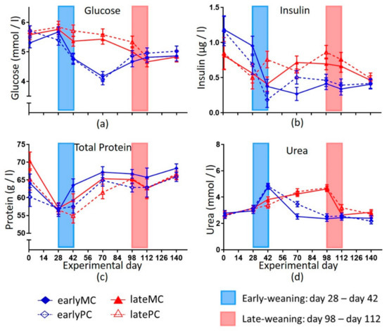 Blood concentrations of the glucose (a), insulin (b), total protein (c) and urea (d) of calves. Early-weaned calves were weaned gradually between days 28 and 42 of the trial. Late-weaned calves were weaned gradually between days 98 and 112 of this trial. Data shown as LSmeans ± SEM, early-weaned calves from multiparous cows (earlyMC) n = 16, late-weaned calves from multiparous cows (lateMC) n = 16, early-weaned calves from primiparous cows (earlyPC) n = 15, late-weaned calves from primiparous cows (latePC) n = 12.