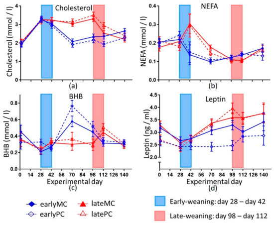 Indicators for lipid metabolism of calves. Shown are cholesterol (a), non-esterified fatty acids (NEFA) (b), beta-hydroxybutyrate (BHB) (c) and leptin (d). Early-weaned calves were weaned gradually between days 28 and 42 of this trial. Late-weaned calves were weaned gradually between days 98 and 112 of this same trial. Data shown as LSmeans ± SEM, early-weaned calves from multiparous cows (earlyMC) n = 16, late-weaned calves from multiparous cows (lateMC) n = 16, early-weaned calves from primiparous cows (earlyPC) n = 15, late-weaned calves from primiparous cows (latePC) n = 12.