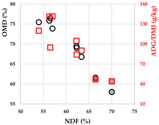 Cohort averages of estimated organic matter digestibility (OMD) (black circles) and feed efficiency ratio (ADG/DMI) (red squares) vs. NDF of Galle heifers (empty) and Borculo heifers (colored filling).